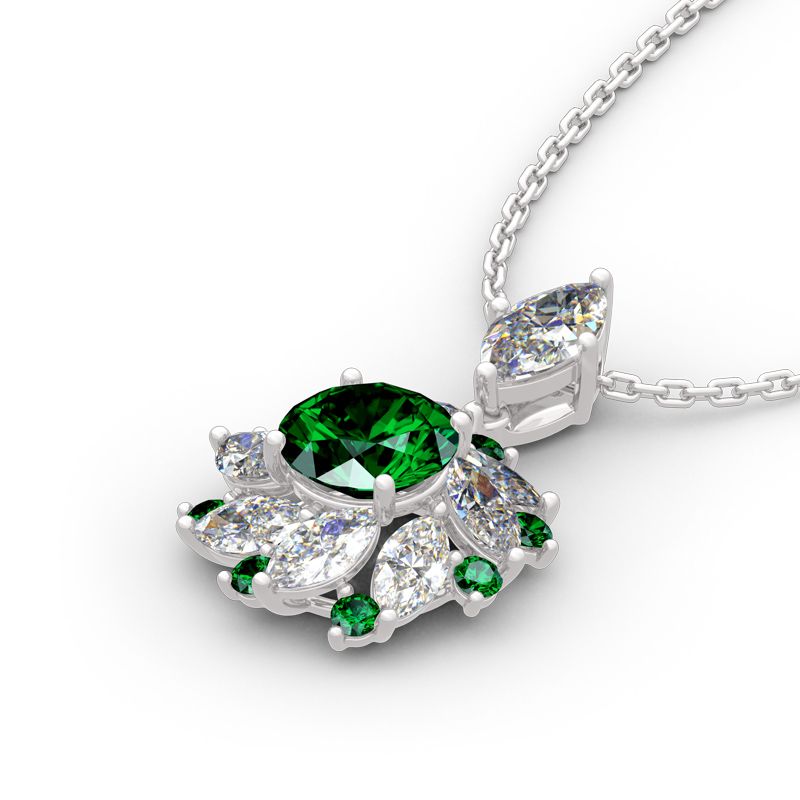 Exquisite and stunning, this necklace will capture your heart at first sight. Inspired from ballerina’s flying skirt, it presents an elegant silhouette that will remain endlessly enchanting. Glistening double halo surrounds the emerald green center stone to create a sparkling and luxurious look. Crafted in sterling silver, it’s durable and comfortable for daily wear. Add this masterpiece to your jewelry box and you won’t be disappointed.