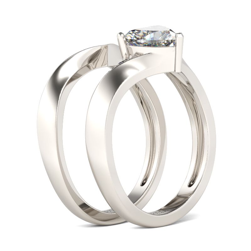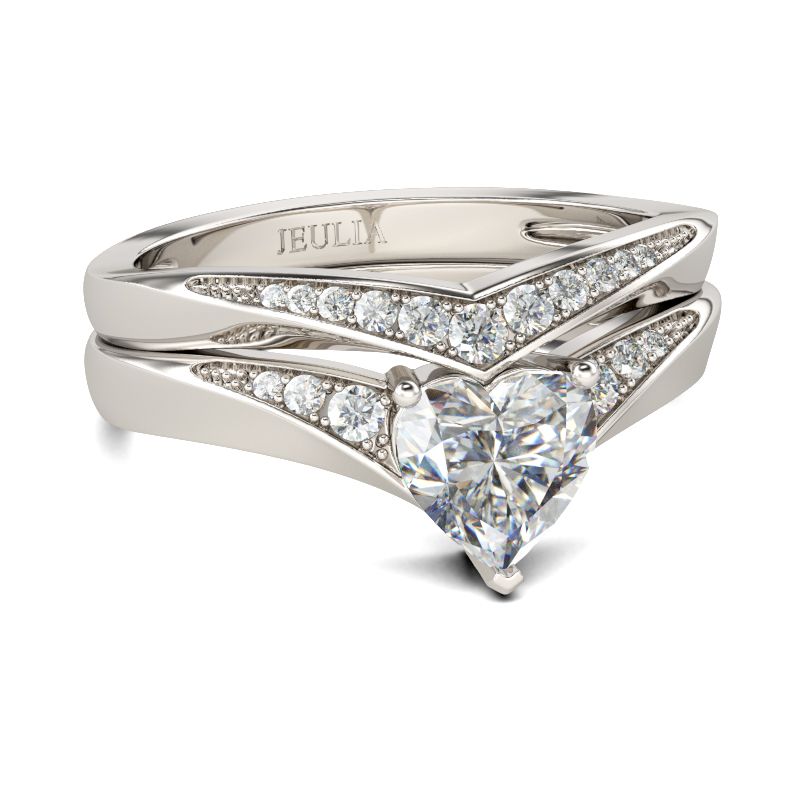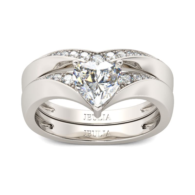Mark the beginning of your lifetime together with this lovely ring set. This exquisite style features a sparkling heart-shaped center stone flanked by smaller round stones. This ring set is a symbol of faithfulness and everlasting love. With the coordinating band,this beautiful style is a perfect gift for any lady or the perfect reason to spoil yourself!