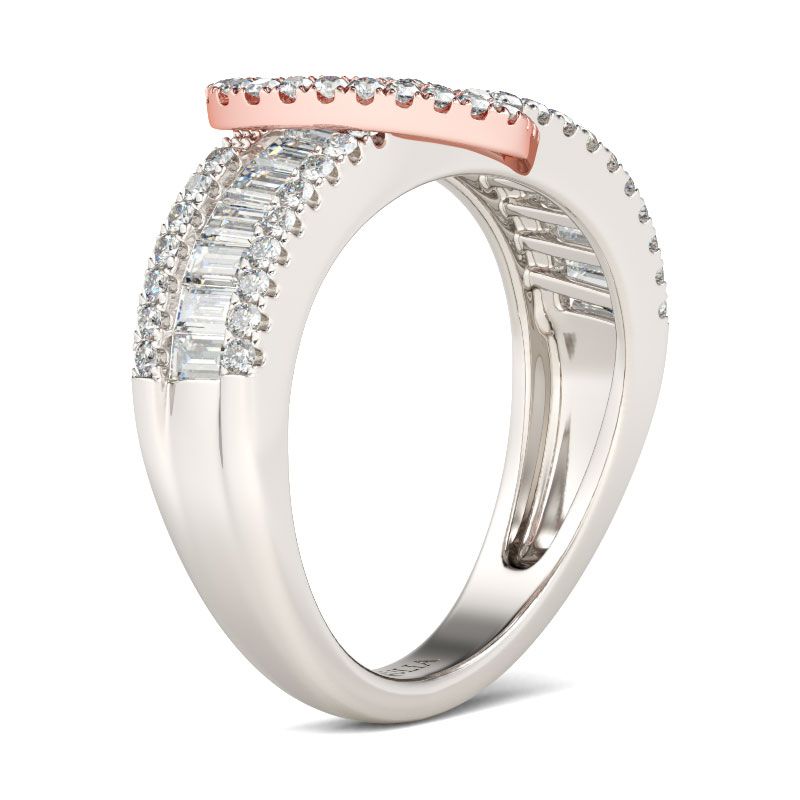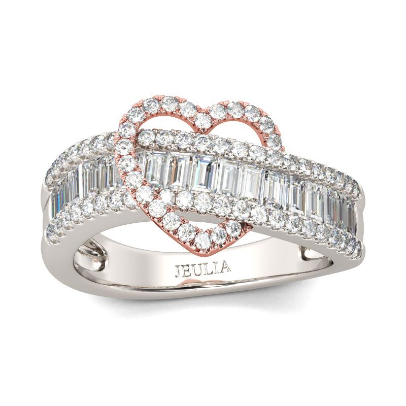 This statement of romance will make her day and illuminate her finger. Designed in two tone, a lovely open heart design shines at the center of the band, while sparkling emerald cut stones are set across the center of this band. Borders of smaller round stones grace the top and bottom of the band, completing this exceptional design. This band makes a stunning statement of everlasting love.