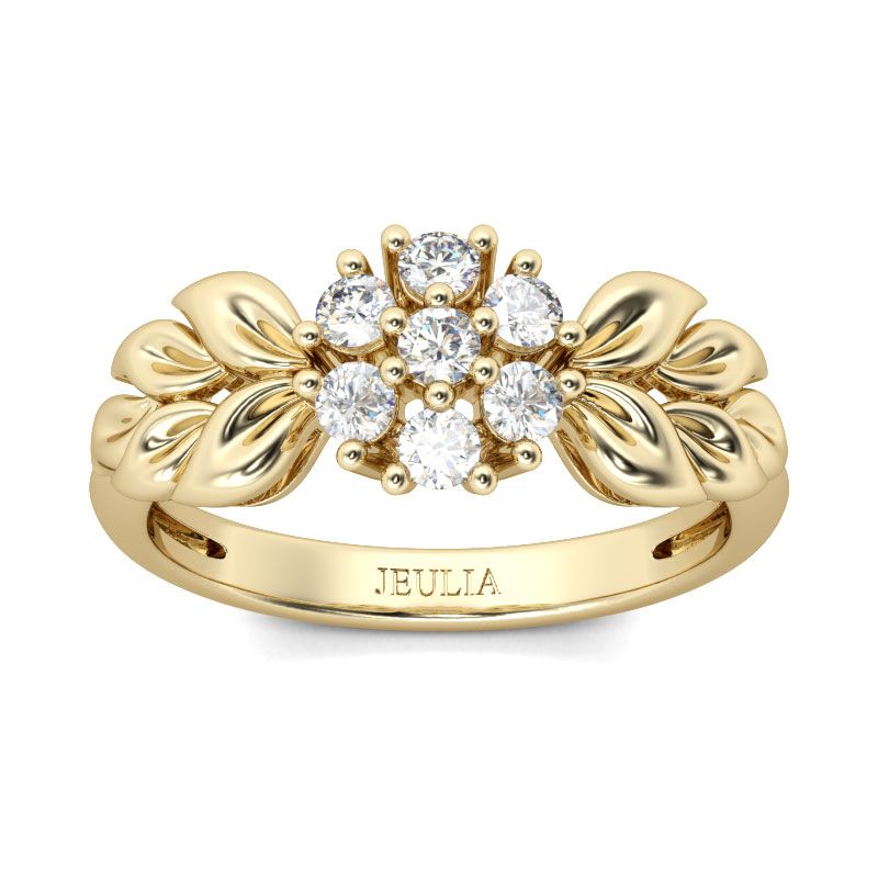 Stunning and delicate, this flower ring will capture your heart at first sight. Flower is one of the most popular design elements in jewelry. It’s often related with beauty,vitality and happiness, like your love. Crafted in gold tone sterling silver, the ring is sculptured in a shimmering flowers accented with a cluster of leaves on both sides. It will certain to show an exquisite look on your finger. Never miss it.