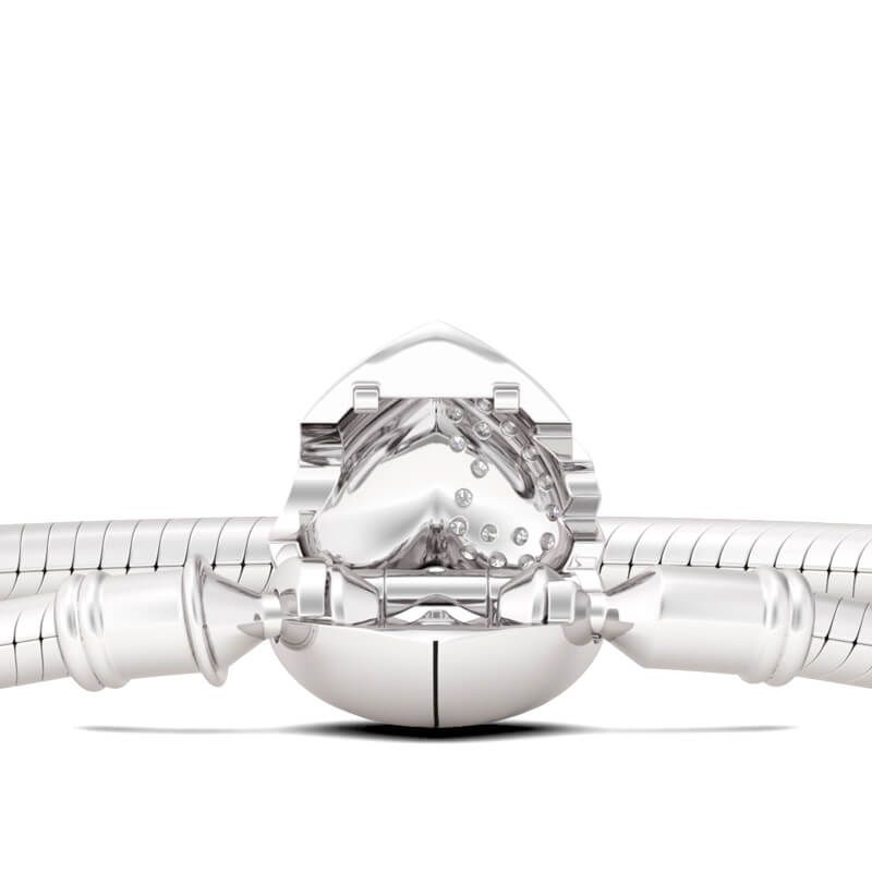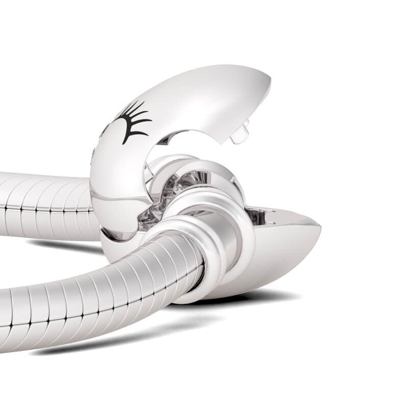 Crafted from 925 sterling silver the clasp features a heart shape. It divided into two part of the heart, half is high polished silver with a smiling eyelash on it, another half is fully paved clear pure crystal stones with a small red enamel heart on it. Start your charm collection with this lovely bracelet.