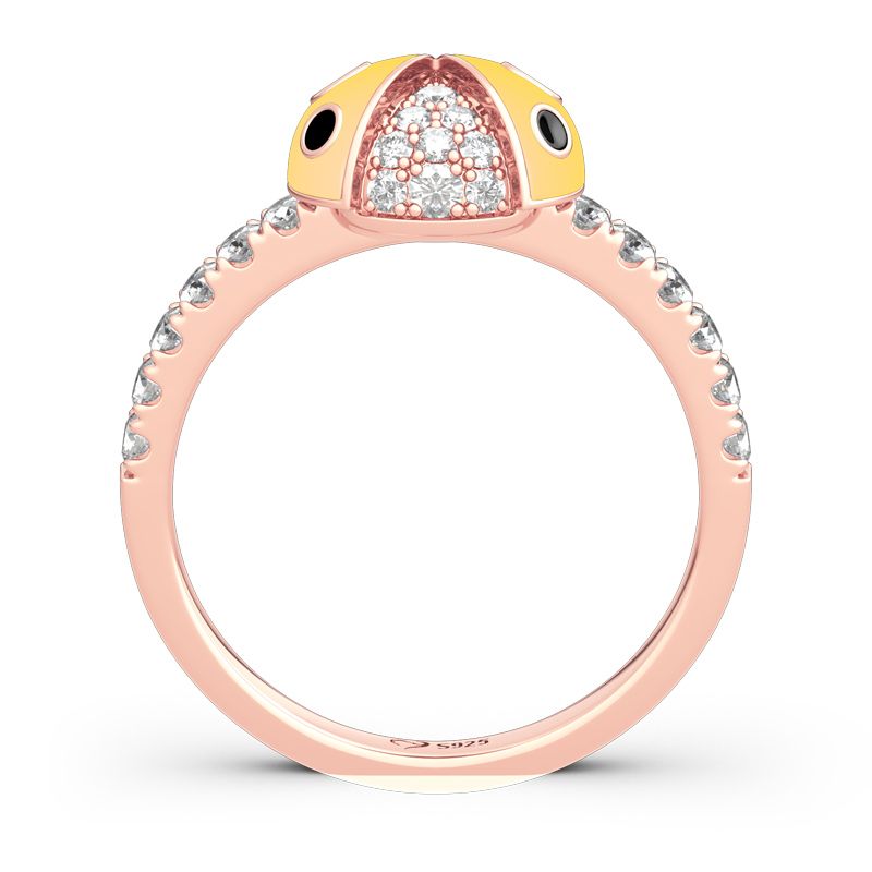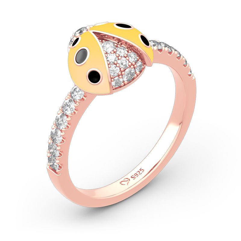 Pretty and petite, this nature inspired ladybug ring is perfect for those who covet delicate jewelry. Crafted in sterling silver, it features black spots and little round stones set in the yellow ladybug, while additional stones adorn the shank to add more sparkles. A ladybug is believed to be an embodiment of Lady Luck, bringing good fortune and prosperity along with it. As the insect leads a vibrant and colorful life, it influences you to experience the joys of living to the fullest.
