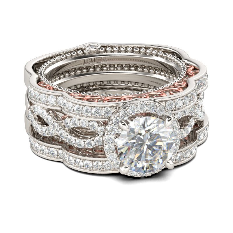 Milgrain Three Stone Round Cut Sterling Silver Ring Set