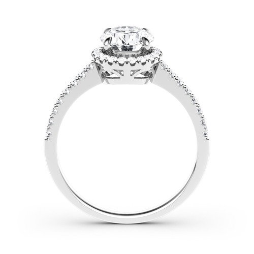 This engagement ring shimmers with all your beautiful moments to come. A brilliant round cut stone is wrapped in a halo frame of sparkling round stones, and additional stones extend halfway down each side of the thin band, adding extra shimmer to the look of the ring. Simply gorgeous, traditional and understated, this is the perfect engagement ring for a woman who wants something classic and beautiful.