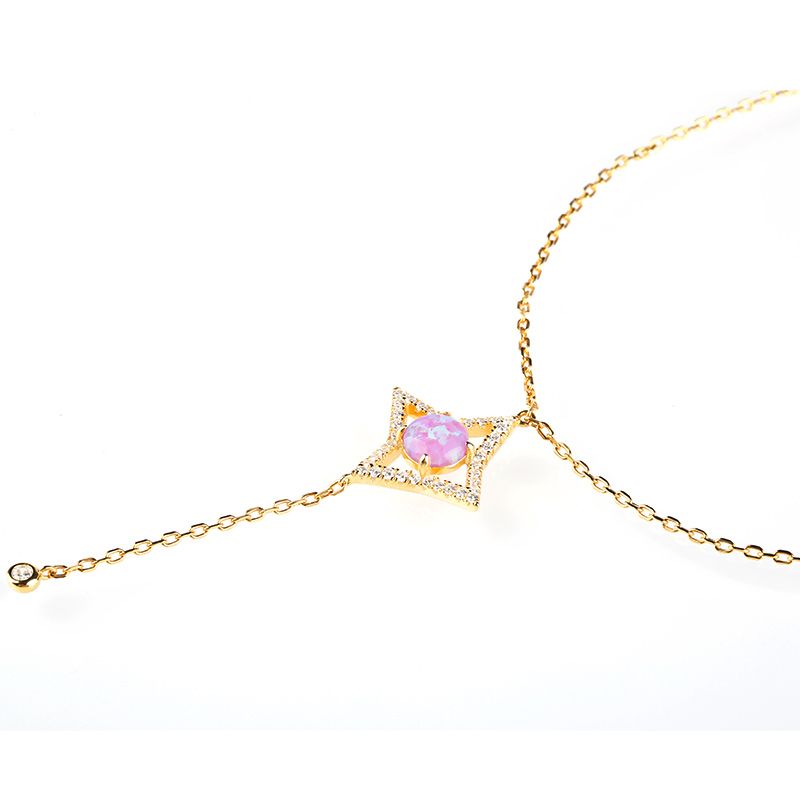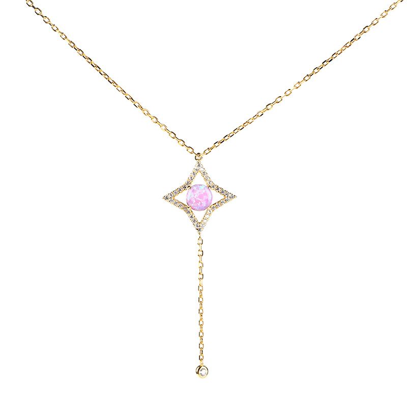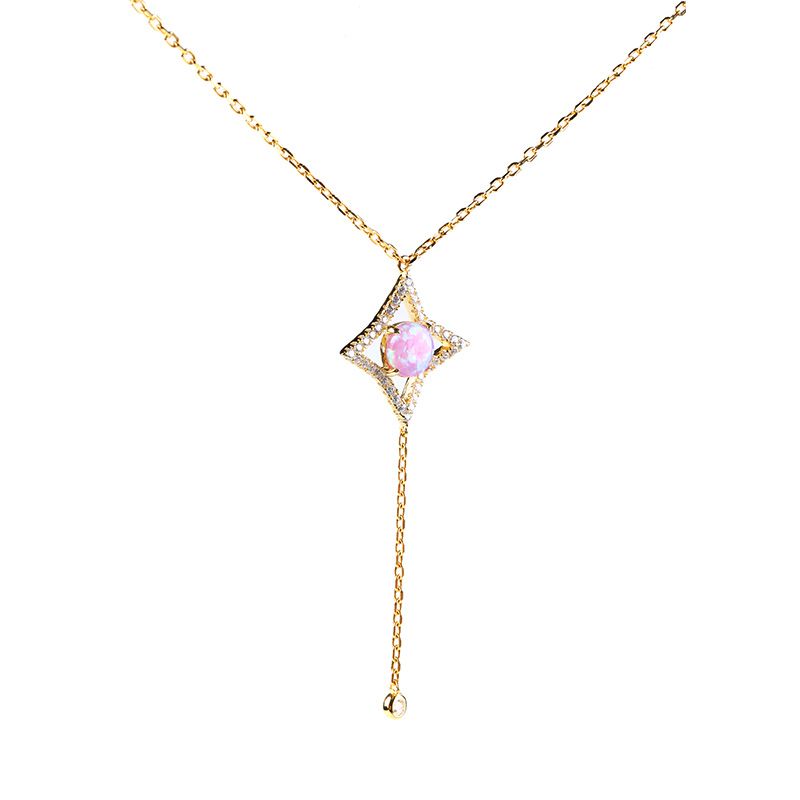 Pretty,dainty and feminine, this opal necklace is sure to be treasured by anyone you give it to. It showcases a beautiful pink-purple color opal encircled in a shimmering star-shaped frame. The opal stone has different flashes of color when it hits the light. May you have a bright and dazzling future as stars.