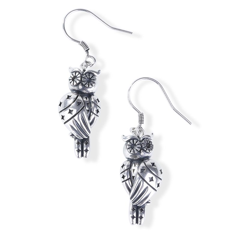 Crafted in oxidized silver, these owl earrings capture the natural beauty and spirit of owls. Stars are sculptured on the owlet to complement this lovely design. Symbolizing wisdom and a love for nature, this design is a perfect gift for any lady or the perfect reason to spoil yourself!