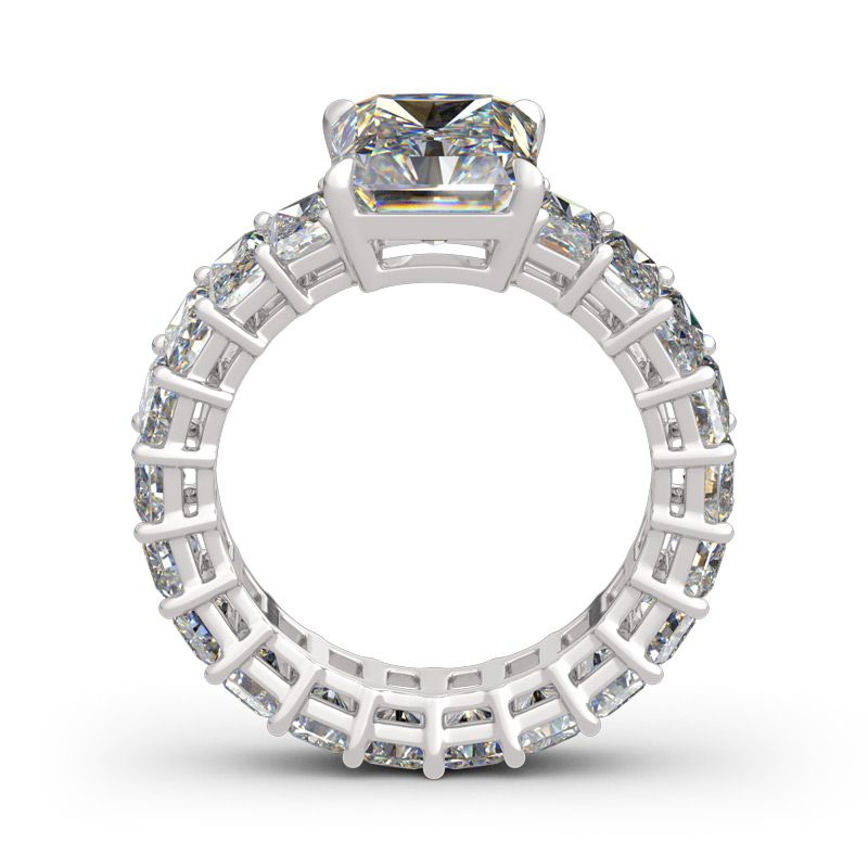Shining with undeniable radiance, this ring set is eye-grabbing. Crafted in sterling silver, this design features a radiant cut stone shines brightly at the center, while more radiant cut stones completely surround the ring’s shank, completing the sparkle look. Simply dazzling, this beautiful style is sure to become a treasured keepsake.