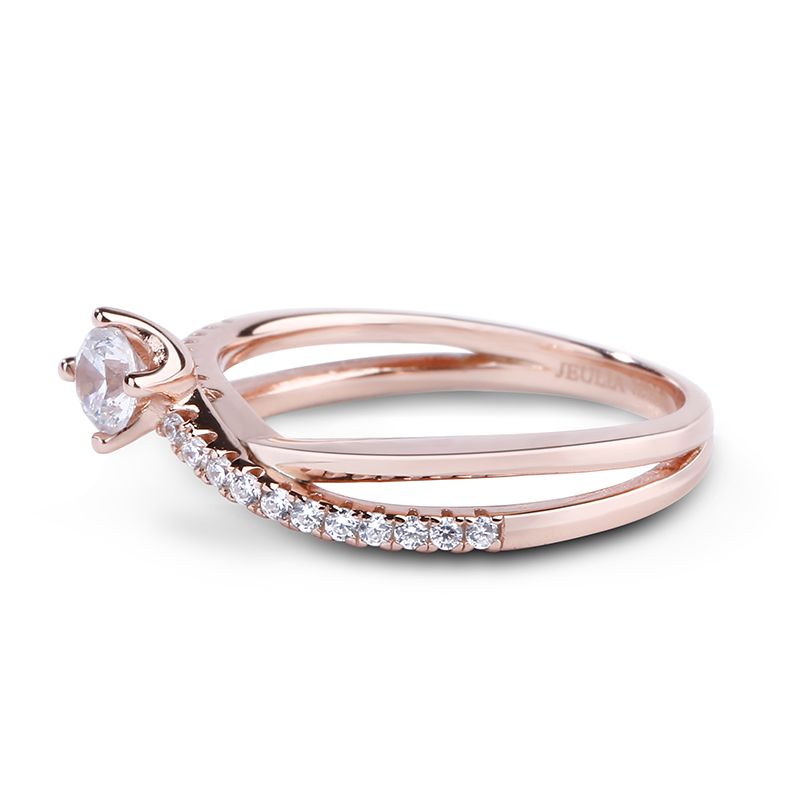 Dainty and delicate, this ring suits her feminine style. Created in rose gold tone, this ring showcases a round-cut stone at the center. Polished and stone-lined ribbons flank the center stone, creating the ring’s charming split shank. As lovely as she is, this ring is a look she’ll treasure.