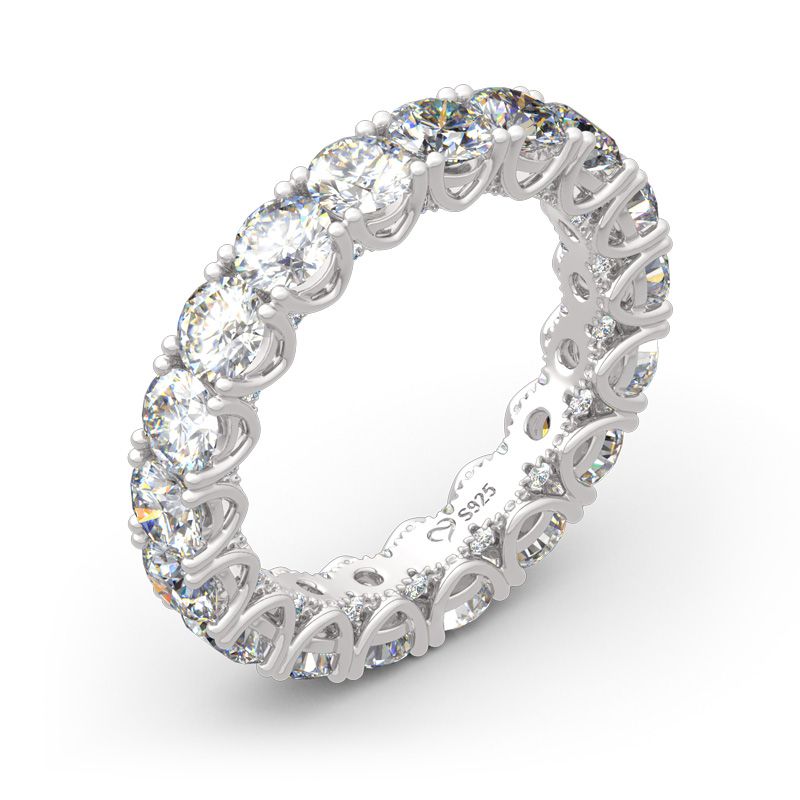 Celebrate your everlasting love story with this eternity band. Stunning as a wedding or anniversary band, this band shimmers with prong-set round stones that completely surround the band. On trend and shimmering, this beautiful band adds out-of-this-world sparkle to your style.