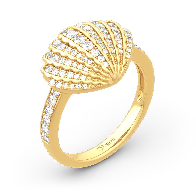 Level up your summer look with our seashell ring! Magically speaking, scallop shells are said to represent travel and movement. Expertly crafted in sterling silver, this sculpted oyster shell design features an lines pattern set with shimmering stones.A lovely look, certain to garner compliments, this comfort-fit ring captivates with round stones and a polished shine. Buffed to a brilliant luster and affords her undeniable glamour.