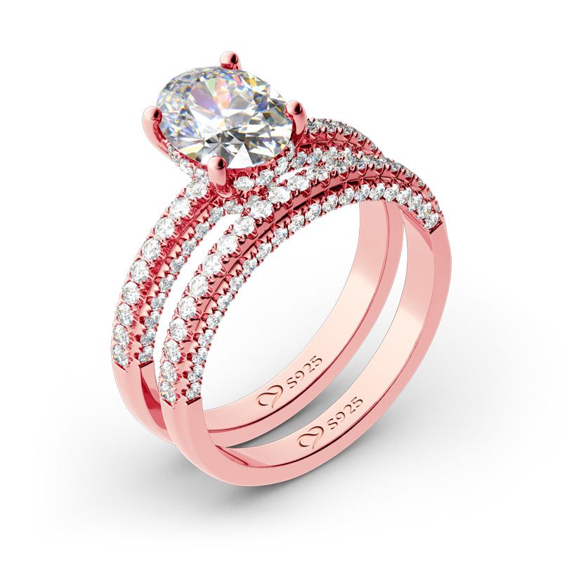 Sparkling and luxurious, the bridal set will capture your heart at first sight. Designed in feminine rose gold color, this style shimmers with a sparkling oval cut center stone. The ring’s shank and coordinating band are paved with round stones in three sides, creating a dazzling look from every angle. Simple and stunning, it’s certain to become a treasured favorite.