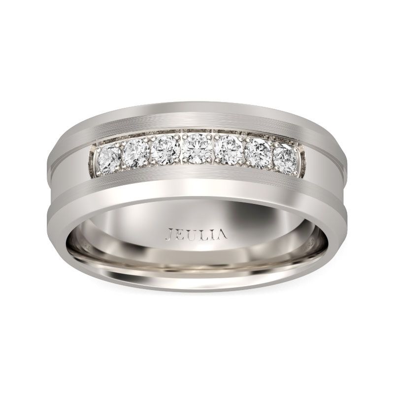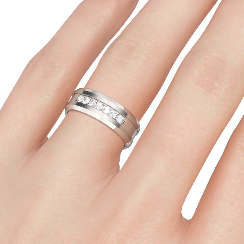Surprise the man you love with this impressive band. Crafted in stainless steel, this dazzling style showcases seven stones glistening across the center. This comfort-fit ring is a handsome everyday look he’ll wear every day.
