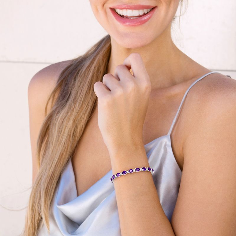 So glamorous, this on-trend bracelet elevates your attire. Fashioned in sterling silver, this impressive design features alternating purple stones and smaller white stones. Elegant and unique, you can wear one, two or more bolos together to create a look all your own. A great anytime choice, this fashion bracelet is sure to become an instant favorite.
