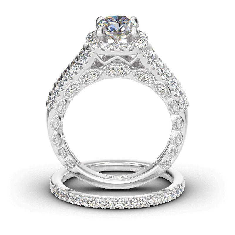 Stunning and sparkling, this ring set will capture her heart at first sight. Crafted in sterling silver, the engagement ring features a glistening round-cut center stone wrapped in a shimmering halo. The ring’s shank is set with additional stones and adorned with milgrain detailing for extra elegance and sparkle. On your wedding day, speak your vows as you slip the coordinating wedding band on her waiting finger.