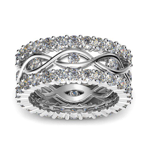Graceful and elegant, this three piece band set is a smart look anytime. Expertly crafted in sterling silver, the middle band features two ribbons twist together in an eye-catching pattern. Two eternity band of round stones grace the top and bottom, completing this unique and intriguing look. You can customize this ring by choosing metal and stone colors. This is the perfect gift for your loved one or a great accessory to add to your own collection.