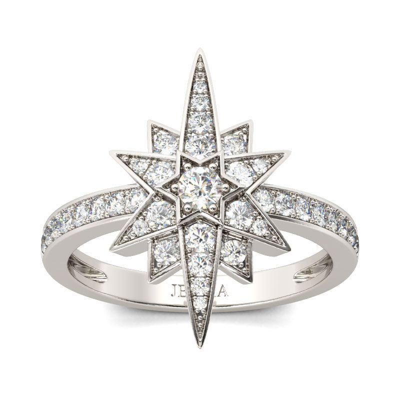 Let the star decorate your life! This ring design is inspired from the ten pointed star. Every point of the star is set with white stones and glistens under the light. The band of the ring is paved with sparkling stones, which add beauty to the ring. You can wear the ring separately or stack it with other rings to create an unique look.