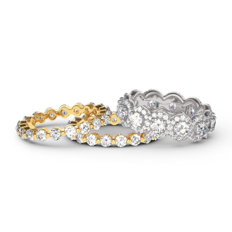 Luxurious and breathtaking, this three-piece band set will capture your heart at first sight. Crafted in two tone sterling silver, the band set features a sparkling halo round-cut wedding band with two coordinating bands. With all the glistening stones,the band will sparkle perfectly from every angle.It will surely be an eye-catcher in every occasion.