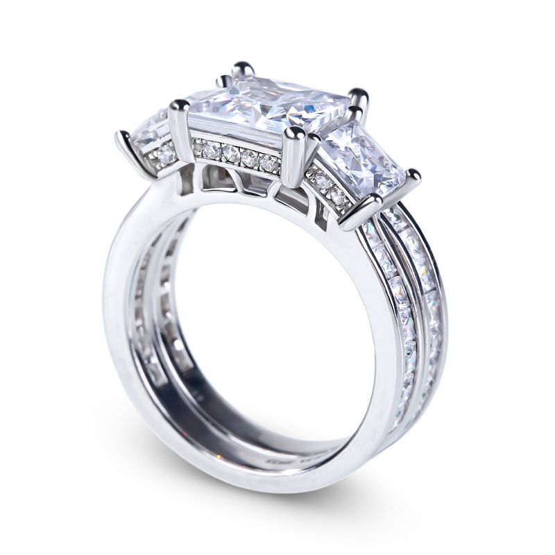 Honor the one you love with a three stone ring set that celebrates your life together. As bold and brilliant as your love, this ring features a trio of exceptional princess-cut stones that sparkle brightly.These magnificent stones are perfectly aligned atop the ring’s shank while additional stones adorn the shank and the matching band for extra shimmer. A graceful, elegant design that proudly proclaims your commitment, this ring will both thrill and delight her.