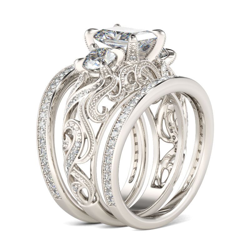 Three Stone Scrollwork Radiant Cut Sterling Silver Ring Set