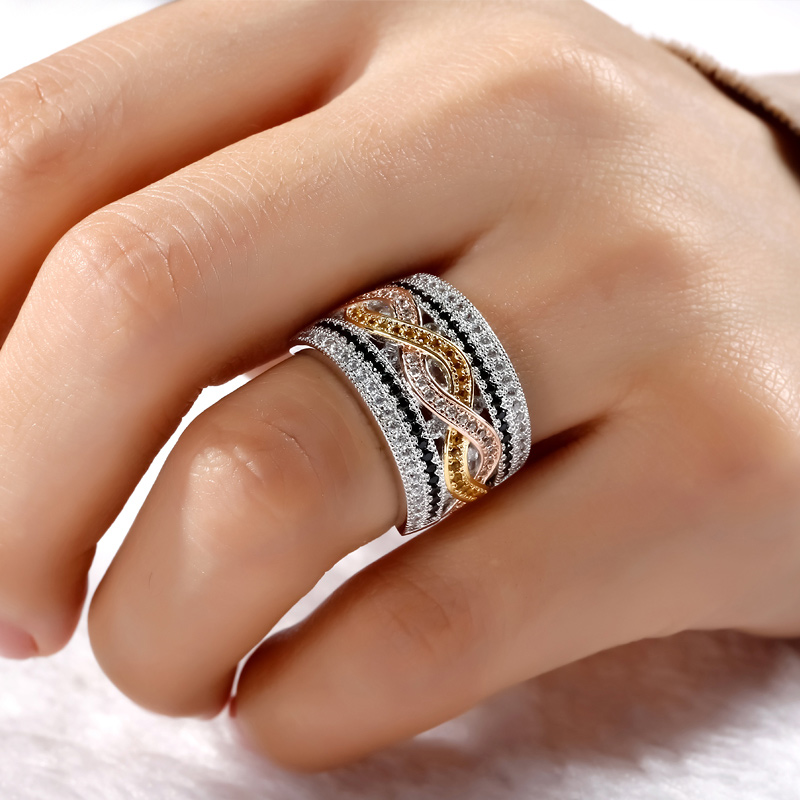 Rich with color and sparkle, this tri-tone band are perfect for any occasion. Two twisting rows of white and yellow stones shimmer accross the center of the style, while rows of sparkling white and black stones sparkle along the edges of the band, creating a unique and romantic design that never succumbs to trends.