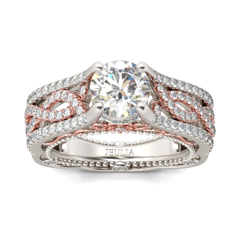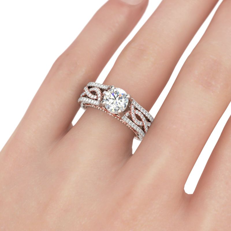 Make an elegant statement with this dazzling ring. It features a shimmering round cut stone at the center, while smaller round stones decorate the shank and rose tone twisting. The delicate rose gold tone filigree details on the side of the ring adds elegance and vintage aesthetics to it. This sure-to-be-cherished engagement ring is certain to forge a lasting memory in your heart.