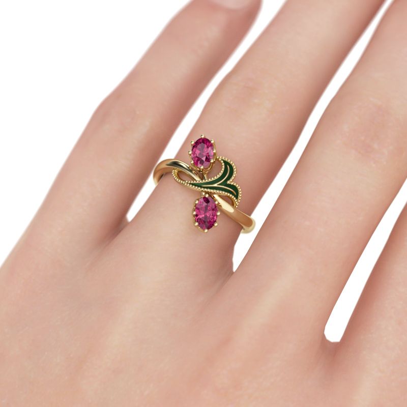 Dainty and delicate, this flower ring makes an adorable gift for loved one or yourself. Crafted in gold tone sterling silver, the ring is sculptured with an asymmetric bypassing shank. Two fushia oval-cut stones are set at the center as blossoms of the ring. With the green enamel leave, the ring shows a lively and lovely look. Treat your self or delight her with this piece.