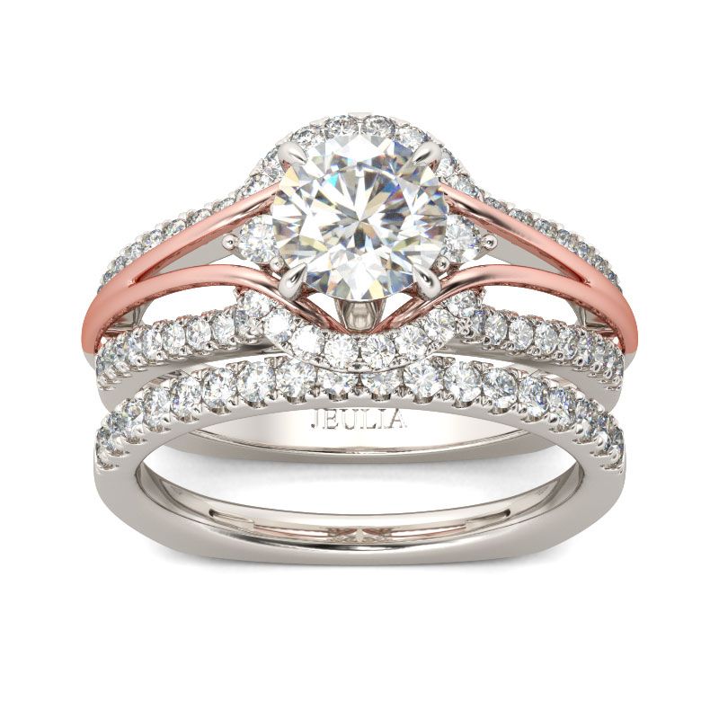 A brilliant celebration of your love, this sparkling bridal set symbolizes your unforgettable moments. Crafted in fine sterling silver, the ring features a sparkling round cut center stone with two little round stones on each side.Along the graceful split shank, split loops of rose gold tone lend a bright polished ribbon detail.This bridal set is a celebration of your years together.