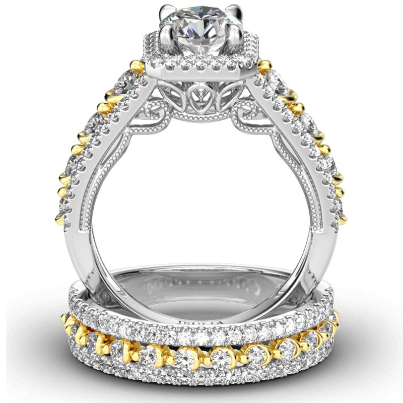 Beautifully crafted, this beautiful style is sure to become a treasured keepsake. A sparkling round-cut stone wrapped in a halo frame of smaller round cut stones that shimmers at the center of this style.The intricate scrollwork along the edges of the shank makes this piece truly distinctive, and the sparkling round stones on the shank evoke sophisticated beauty that cannot be duplicated. Ask for her hand with the elegant ring, and seal your commitment with an equally beautiful wedding band.