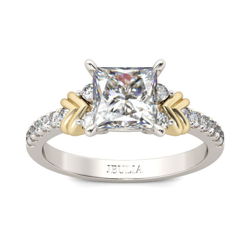 Delicate and sparkling, this rings will be a nice holiday gift for yourself or loved one. Crafted in two tone sterling silver, the engagement ring features a princess-cut stone accented with two cluster round stones on both sides. Two gold tone hearts and glistening round stones adorn the shank. The ring will be certain to show a beautiful and glistening look on your finger. Treat yourself as a holiday gift with this luxurious piece.