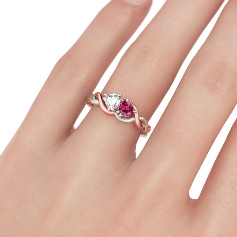 Delicate and meaningful, this ring honors your love. Crafted in two tone sterling silver, two heart-cut center stones are set on a two tone twisting shank. The two hearts stands for your loved one and yourself. You two hug and support each other. Treat yourself or surprise her with this masterpiece this holiday.