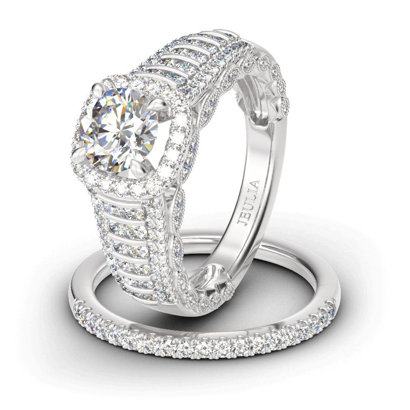 Side Stone Number of Stones : 174 Carat Weight : 1.78 ct Stone Shape : Round Stone Color : Diamond White Stone Size : 1.1, 1.5 mm Stone Type : Jeulia® Stone Setting Information Metal : 925 Silver Weight : 6.29 g Width : 19.5 mm Height : 9.5 mm Thickness : 2.6 mm