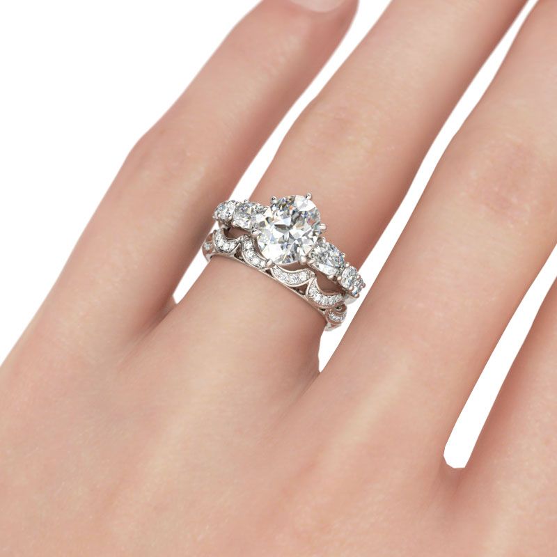 Stunning and sparkling, this ring set will be an eye-catcher everywhere. Crafted in sterling silver, the engagement ring features an oval-cut center stone set on a six-prong mount. Along the shank, oval-cut and round-cut stones are set to add extra sparkle to the ring. With the swirl coordinating band, the ring set will show a…
