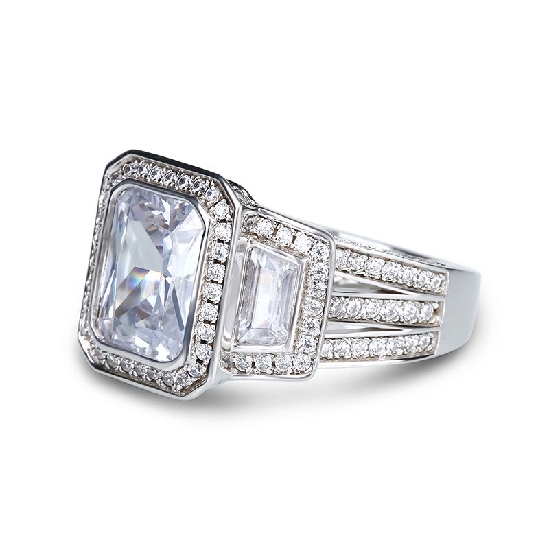 A brilliant and classic look, this three -stone ring will capture your heart at first sight. The three main stones featured on these rings symbolize a couple’s past, present, and future. While every ring is imbued with its own special meaning, this beautiful representation makes three stone rings an especially romantic choice. Crafted in sterling…