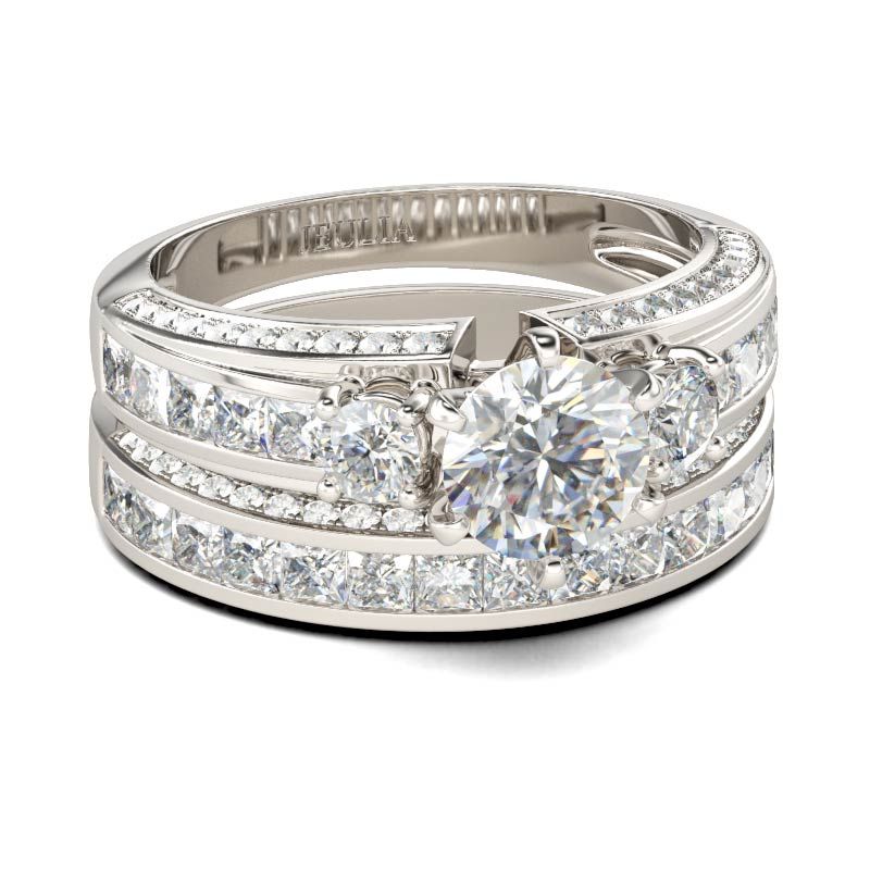 With grace and shimmer, this sparkling bridal set is a classic style that complements her sophisticated taste. It features a round cut center stone wrapped in a glistening halo frame and flanked by two shimmering round stones, bringing out it’s beauty and sparkle. More shimmering stones adorn the ring’s shank, creating a dazzling look from…