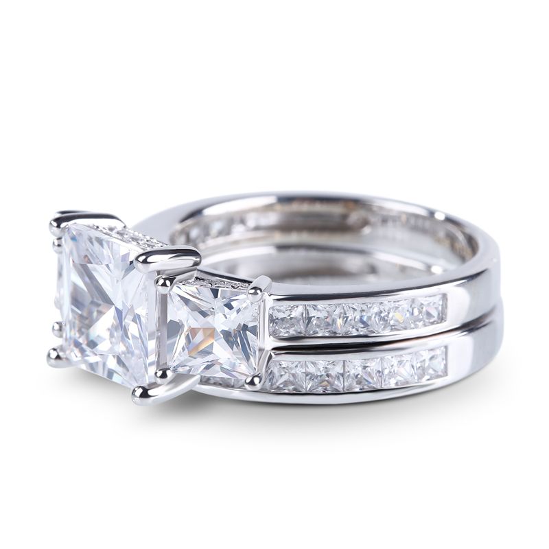 Reflect all the love in your heart with this enchanting three stone ring set. Glittering in bold brilliance, a trio of princess-cut stones shine across the top of this sterling silver ring, while smaller round stones adorn the shank. Your wedding is one of the most special days of your lives. This exceptional ring set…