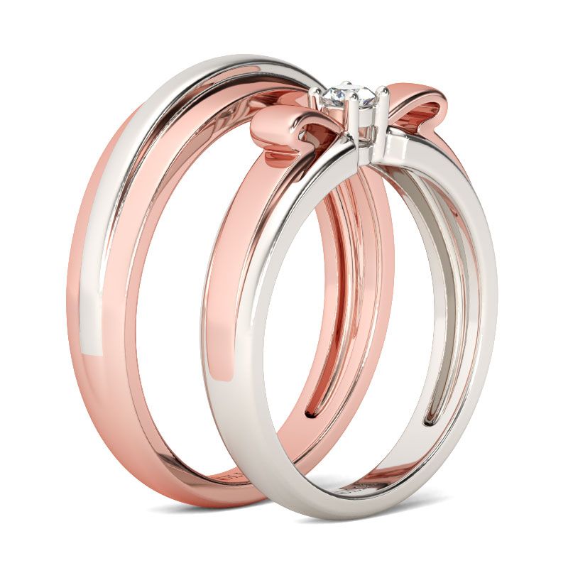 Dainty and delicate, this ring makes an adorable gift for loved one or yourself. Crafted in two tone sterling silver, the ring features a rose gold tone cable design shank intertwined with a glistening ribbon, which shows a unique and elegant look. Two round stones shimmer at the center to complement the design and add…