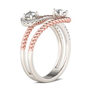 Dainty and delicate, this ring makes an adorable gift for loved one or yourself. Crafted in two tone sterling silver, the ring features a rose gold tone cable design shank intertwined with a glistening ribbon, which shows a unique and elegant look. Two round stones shimmer at the center to complement the design and add…