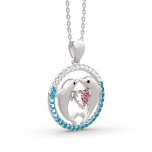 A delicate heart-shaped pink stone. A magical vision of beauty from the sea.Handcrafted in solid sterling silver, two silver dolphins leap above a sparkling ocean wave to form a perfect heart. A heart cut stone glistens in the sun symbolizing this beautiful expression of love. This new and original pendant with complementary chain is the…