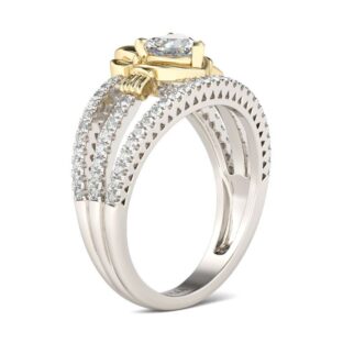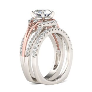 Elegant and sparkling, this ring set will capture your heart at first sight. Crafted in two tone sterling silver, the engagement ring features a round-cut center stone wrapped in a glistening halo. Shimmering stones and rose gold tone ribbons adorn the ring’s split shank. With the coordinating band, the ring set shows a amazing look…