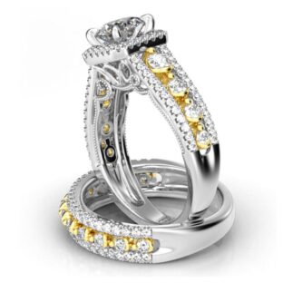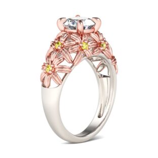 Stunning and sparkling, this nature-inspired ring will capture your heart at first sight. Crafted in two tone sterling silver, this ring features a round cut center stone set on a flower designed shank. The center stone is set at the center of delicate daisies to create a unique look. With several stones on the shank,…