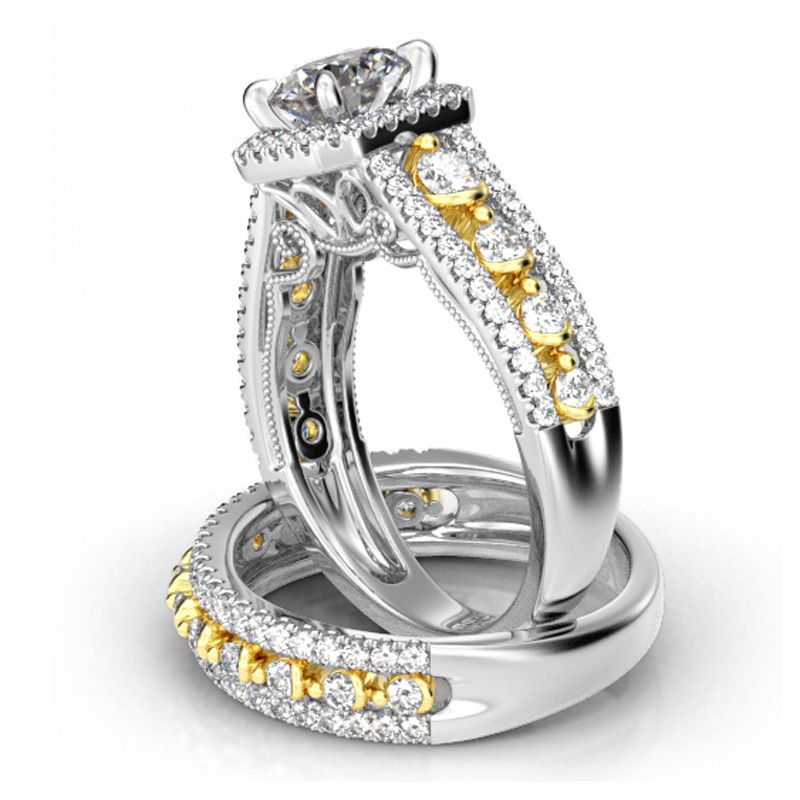 Elegant and sparkling, this ring set will capture your heart at first sight. Crafted in two tone sterling silver, the engagement ring features a round-cut center stone wrapped in a glistening halo. Shimmering stones and rose gold tone ribbons adorn the ring’s split shank. With the coordinating band, the ring set shows a amazing look…