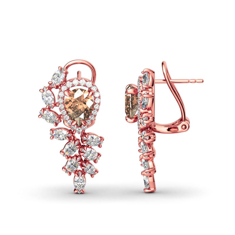Elegant and breathtaking, this pair of earrings will capture your heart at first sight. Crafted in rose gold tone sterling silver, inspired from vintage style, this pair of earrings shows a dazzling and unique look with its pear-cut champagne color center stone and the cluster marquise-cut stones. Treat yourself or loved one with this piece…
