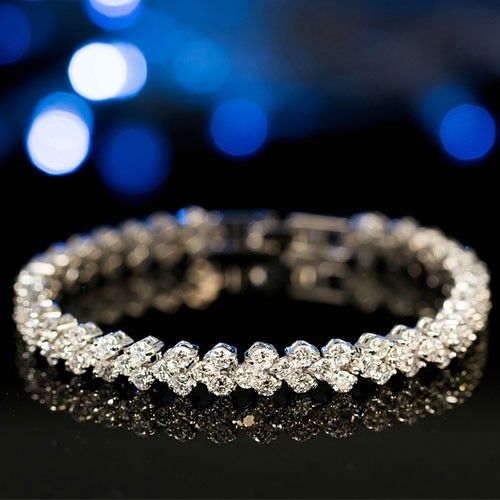 Create a sensation with this fashion-forward tennis bracelet. This graceful look features a fluid line of sparkling trios of round stones. This classic, elegant and timeless look blends sophistication with radiance and sparkle. Setting Information Metal : White Copper Height : 6.65 mm Chain Length : 170 mm