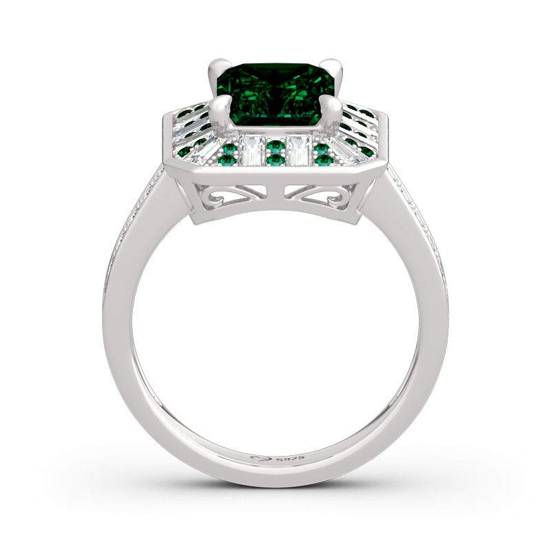 You won’t be able to take your eyes away from this exquisite and elegant ring. Crafted in sterling silver, this shimmering ring features a princess-cut center stone that artfully set to enhance size and sparkle. The additional round and emerald stones line the gracefully crossover shank. This engagement ring is destined to be treasured. All…