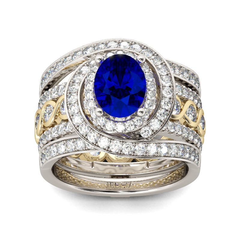 So intriguing, this interchangeable ring set is a classic choice she’ll love. A swirling ribbon frame of dazzling round stones wraps the oval cut center stone in a sparkling embrace and continues into the ring’s shank. The band highlights shimmering round stones encircled in yellow gold tone twisting frames along the design. An elegant look,…