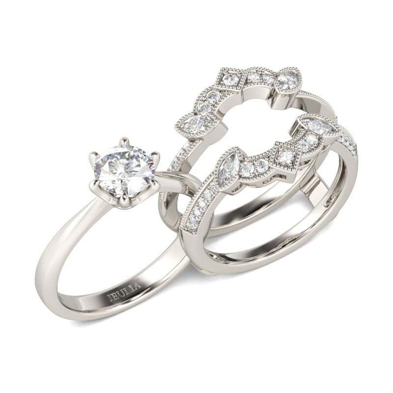 Woo her, wow her and win her with this dazzling bridal set. Expertly crafted in 925 sterling silver, the engagement ring is a high polished classic ring and two bands are in vintage style.They are in perfect match. When worn together, the ring set blossoms like a glistening flower on her finger. Treat your beloved…