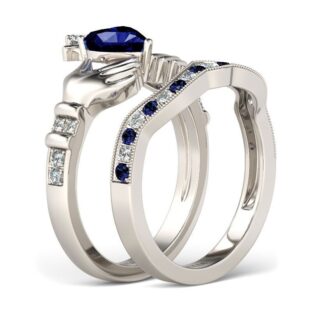 Celebrating love, beauty and Irish culture, this claddagh ring set will capture your heart at first sight. Crafted in sleek sterling silver, the ring features a sapphire blue heart-cut center stone set on a high polished shank. The traditional claddagh ring is a meaningful token of loyalty, friendship and love. The hands represent friendship, the…