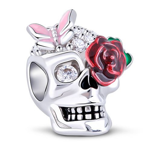 Gnoce skull charm series were inspired by Mexican holiday Day of the Dead. It helps to pray for the one you love who have died and support their spiritual journey. This Skull with Butterfly & Rose Charm made of 925 sterling silver, one eye in pure crystal stone and the other eye in blossom red…