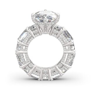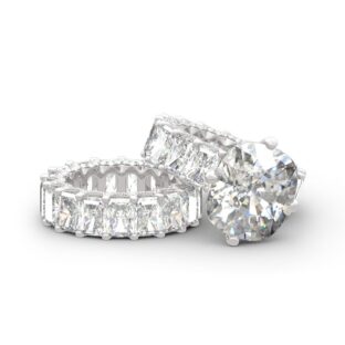 Crafted with care in every detail, this sparkling ring set displays an impressive level of artistry. A cushion cut stone shines brightly at the center, while additional stones adorn the ring’s shank in three sides, creating a truely dazzling look from any angle. On your special day, a coordinating eternity band completes this fabulous ensemble….