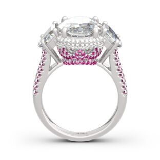 Crafted with care in every detail,this sparkling ring displays an impressive level of artistry. Crafted in sterling silver, it features an oval cut center stone wrapped in halo frames of smaller round stones, while additional stones shine brightly under the centerpiece, creating a truely dazzling look. The shank glistens with more round cut stones,making the…